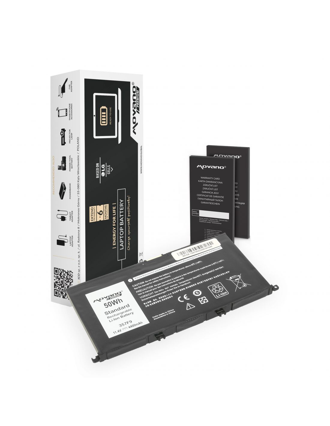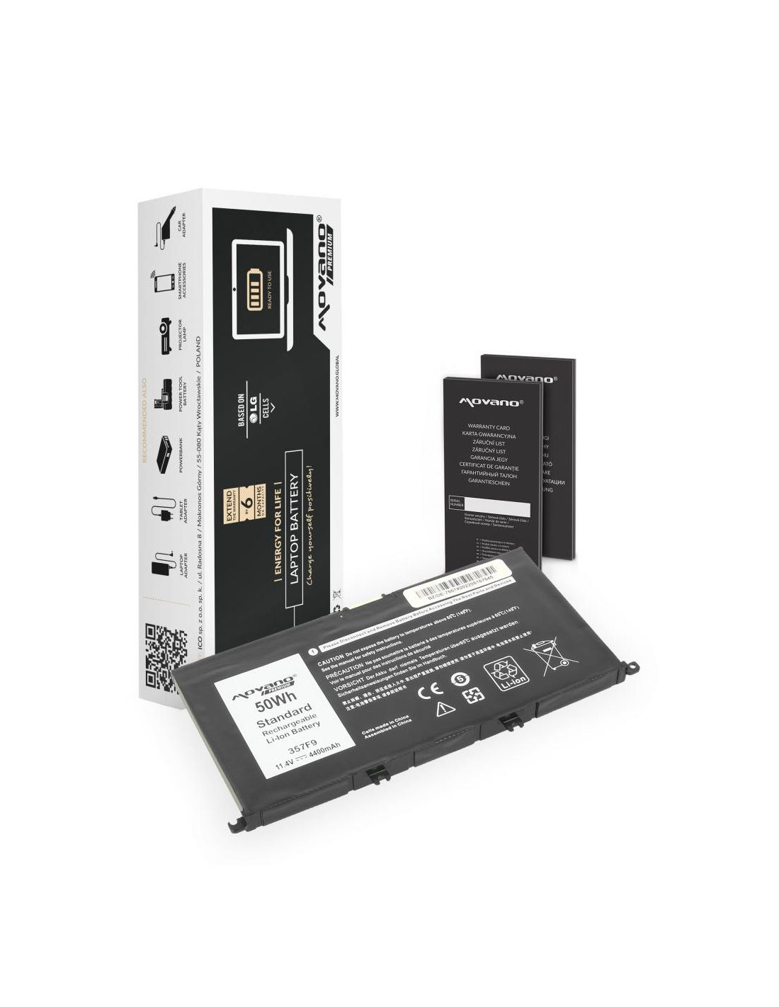 Nowa bateria firmy Movano z certyfikatem jakości CE, ROHS. Akumulator wyprodukowany w oparciu o ogniwa litowo-polymerowe klasy A+ marki LG używane przez czołowych producentów oryginalnych baterii do laptopów. Bateria wyposażona jest w zabezpieczenie chroniące ją przed: przepięciem, przegrzaniem, zwarciem, przeciążeniem prądowym, głębokim rozładowaniem oraz przeładowaniem.