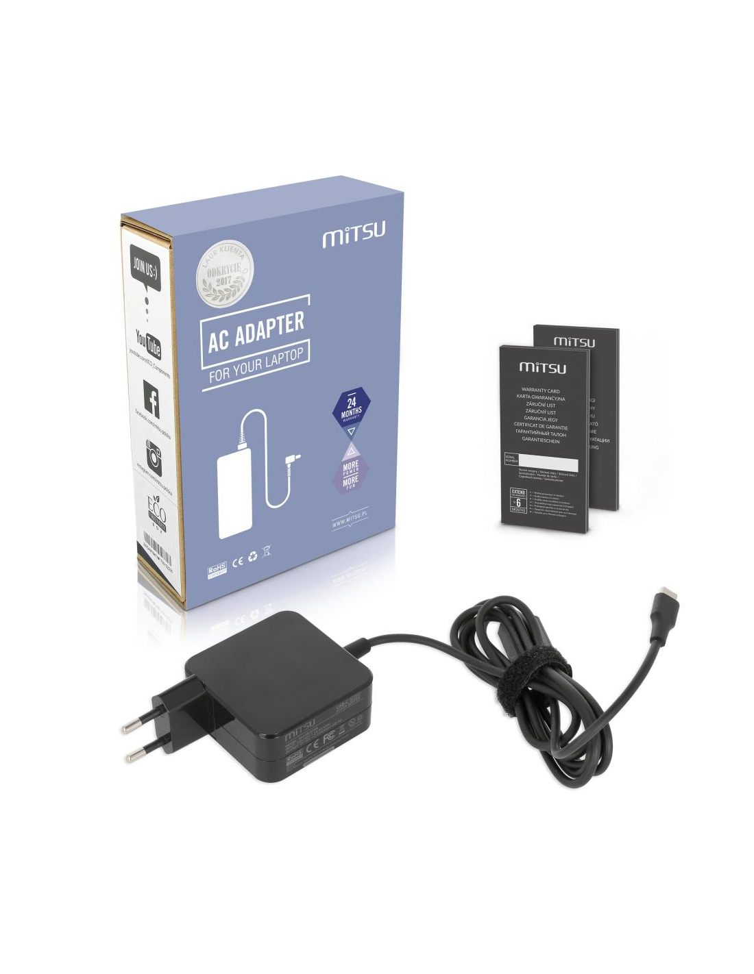 Nowy zasilacz z portem USB-C o mocy 45W firmy Mitsu dedykowany do urządzeń wykorzystujących port typu USB-C (znanego również jako USB Type-C). Dzięki zastosowywaniu nowego typu usb, ładowarka może służyć jako zasilacz do smartfonów, monitorów lcd jak i do nowoczesnych laptopów firm takich jak: Acer, Apple, Asus, Dell, HP, Lenovo. Technologia smartcharge automatycznie dobiera odpowiednie parametry zasilania do podłączonego urządzenia. Niewielkich rozmiarów zasilacz wyposażony jest w doskonałe zabezpieczenia chroniące przed: przepięciem, przegrzaniem, przeciążeniem prądowym i zwarciem. Ładowarki Movano skierowane są do najbardziej wymagających użytkowników, ceniących sobie bezstresową i komfortową pracę. O jakości produktu świadczą uzyskane certyfikaty: CE, ROHS, FCC oraz ścisła kontrola jakości eliminująca powstanie ewentualnych defektów. JAKOŚĆ PRZEDE WSZYSTKIM