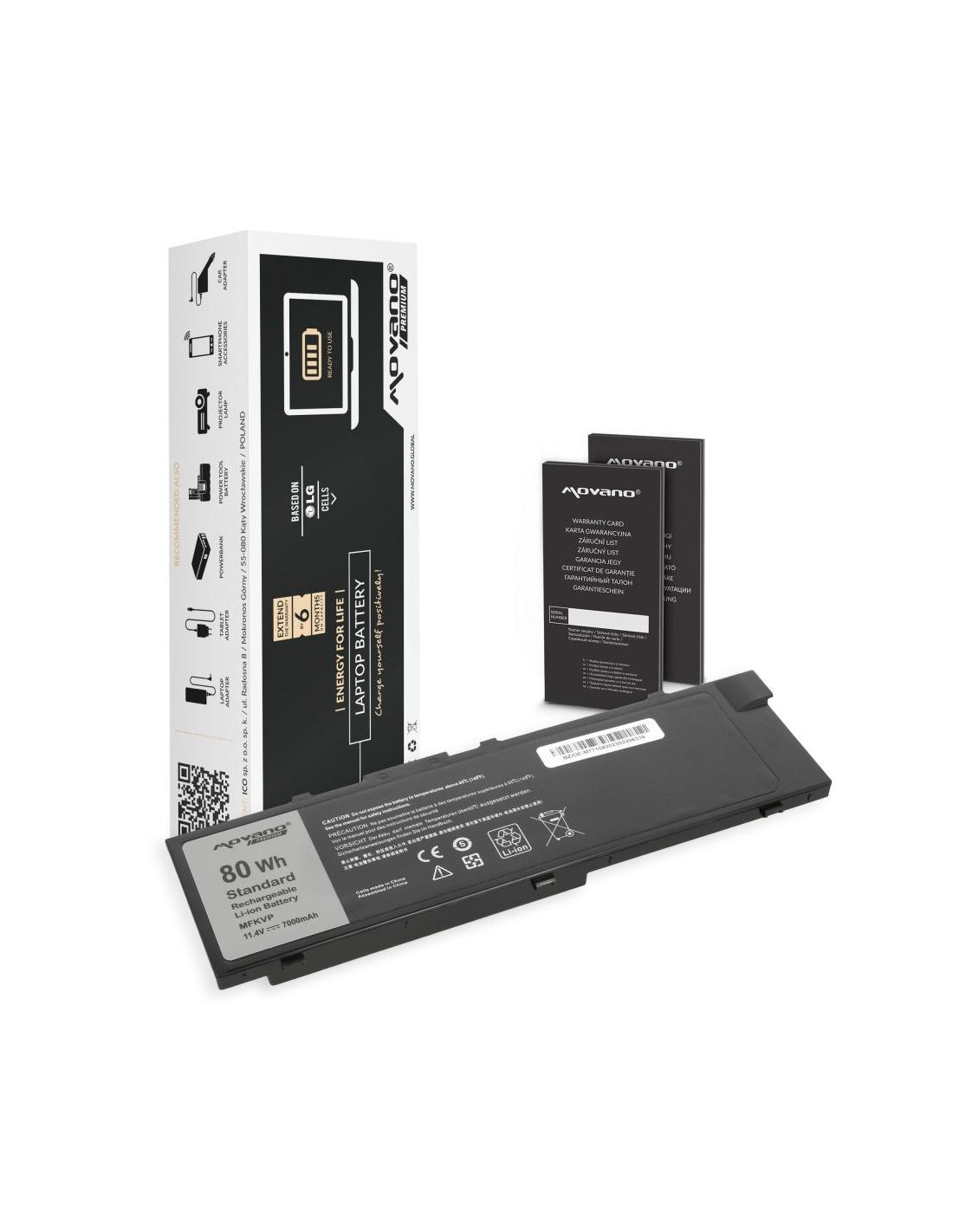 Nowa bateria firmy Movano z certyfikatem jakości CE, ROHS. Akumulator wyprodukowany w oparciu o ogniwa litowo-polymerowe klasy A+ marki LG używane przez czołowych producentów oryginalnych baterii do laptopów. Bateria wyposażona jest w zabezpieczenie chroniące ją przed: przepięciem, przegrzaniem, zwarciem, przeciążeniem prądowym, głębokim rozładowaniem oraz przeładowaniem.