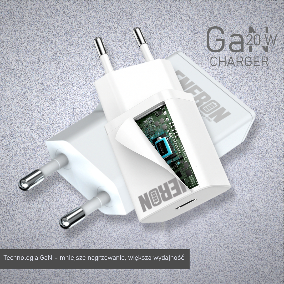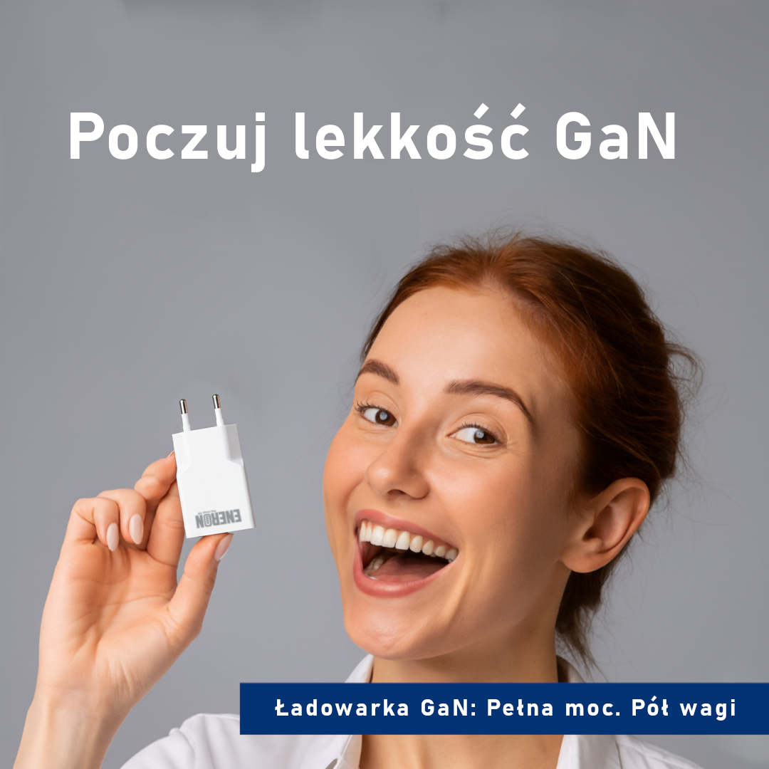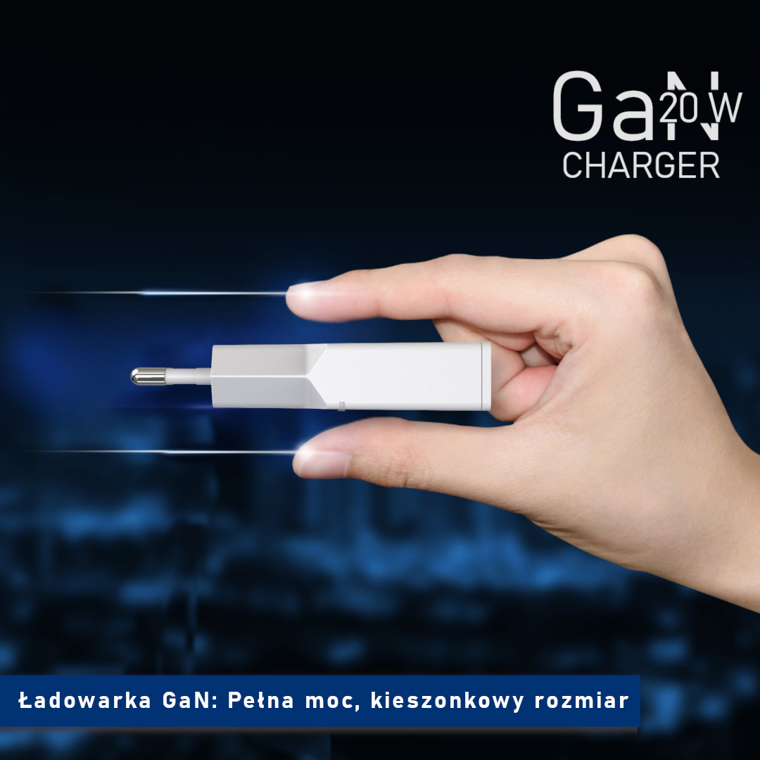 Ładowarka zapewnia super szybkie ładowanie w technologii GaN i jest kompatybilna ze wszystkimi urzadzeniami wymagającymi ładowania do 20W.