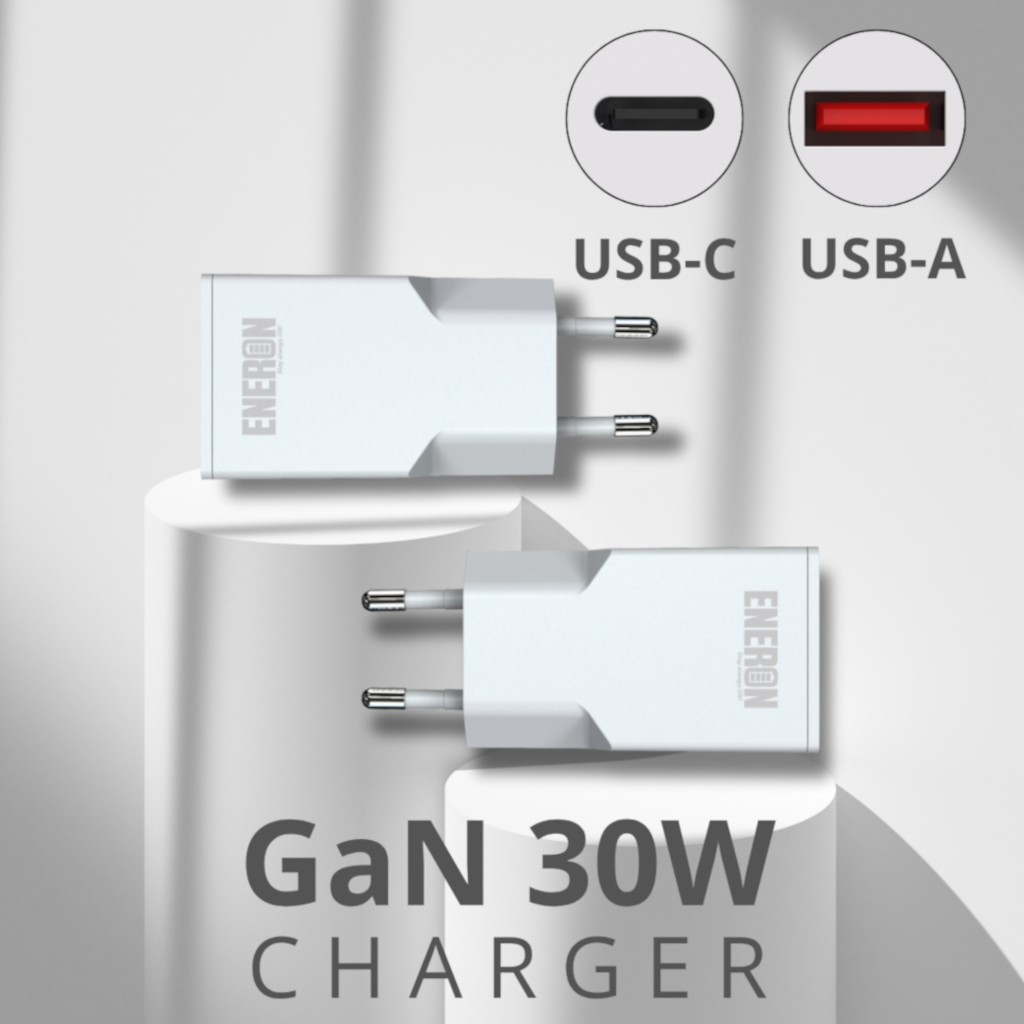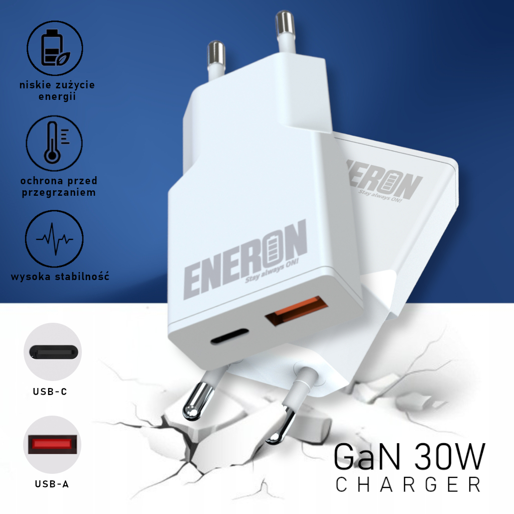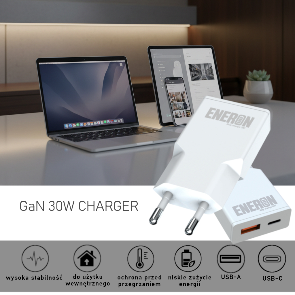 Kompaktowa ładowarka Eneron o mocy 30W, która sama dostosowuje moc dla obsługiwanego urządzenia. Nie musisz obawiać się uszkodzenia Twojego smartfona.