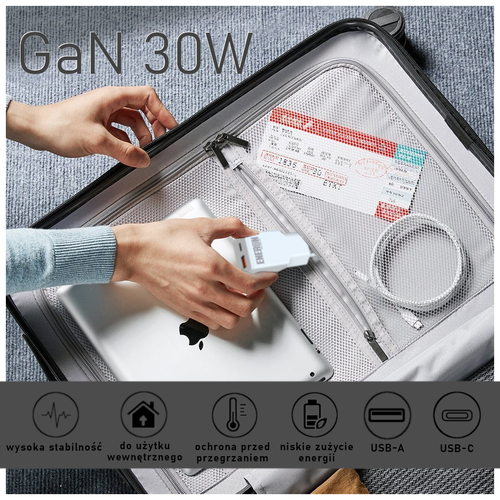 Ładowarka zapewnia super szybkie ładowanie w technologii GaN i jest kompatybilna ze wszystkimi urzadzeniami wymagającymi ładowania do 30W. Wyposażona jest w dwa porty USB-A (max. 18W) i USB-C (max. 30W). Pozwala ładować dwa porty jednocześnie !