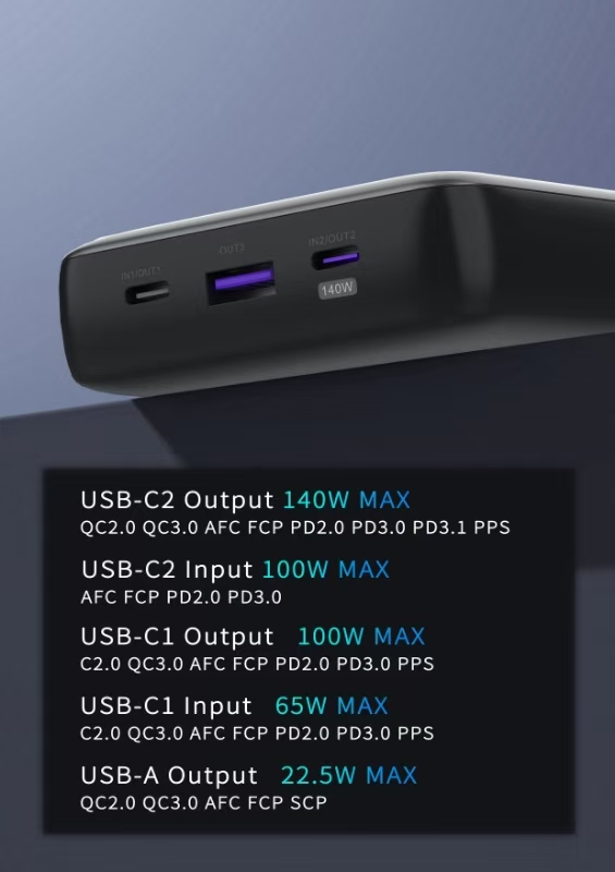 - USB-C2: DC 5.0V-3A 9V-3A, 12V-3A, 20V-5A,28V-5A (PD 140W Max.)