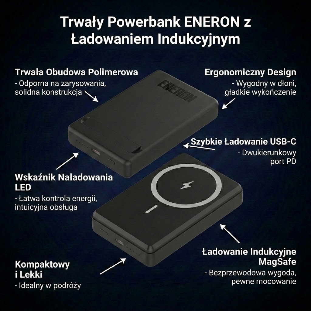 - Mocny i wszechstronny: Bateria 5 000 mAh to zapas energii na cały dzień, a dzięki dodatkowemu portowi USB-C (20W) możesz szybko ładować dwa urządzenia jednocześnie.