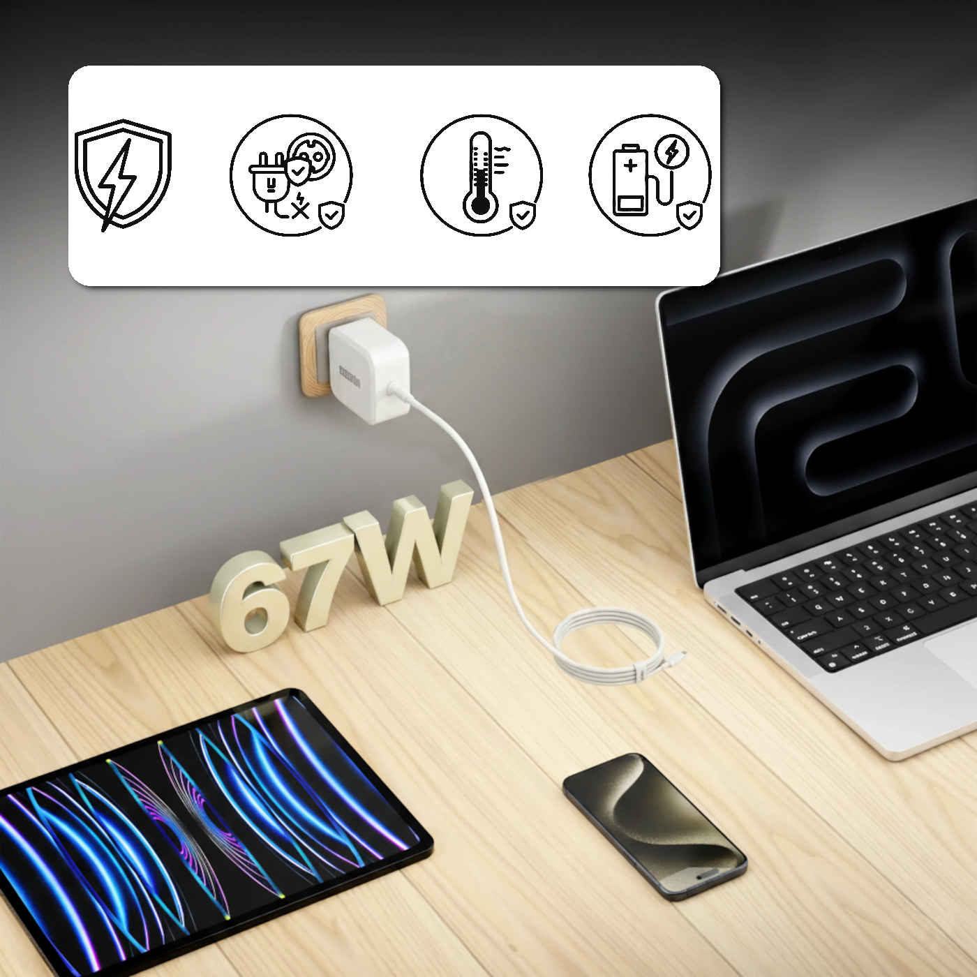 Ładowarka Eneron o mocy 67W, która sama dostosowuje moc dla obsługiwanego urządzenia. Nie musisz obawiać się uszkodzenia Twojego sprzętu, możesz bezpiecznie naładować laptop, tablet czy smartfon.